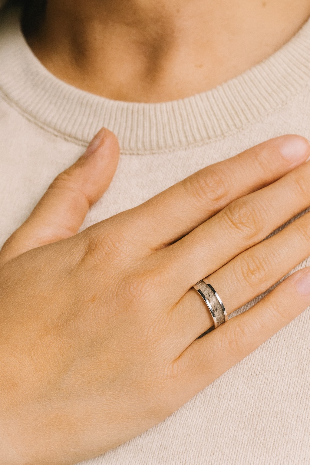 Una alianza para cenizas con una banda central que recorre el anillo al completo, una joya única creada desde cero, artesanal. Su banda central con las cenizas de tu ser querido. Una joya de especial dificultad a la hora de crearla pero que sin duda merece la pena. La alianza se puede hacer en todas las medidas, tanto para hombre como para mujer, la alianza está disponible en plata de ley 925 de la mejor calidad, también disponible en otros materiales como pedido personalizado.