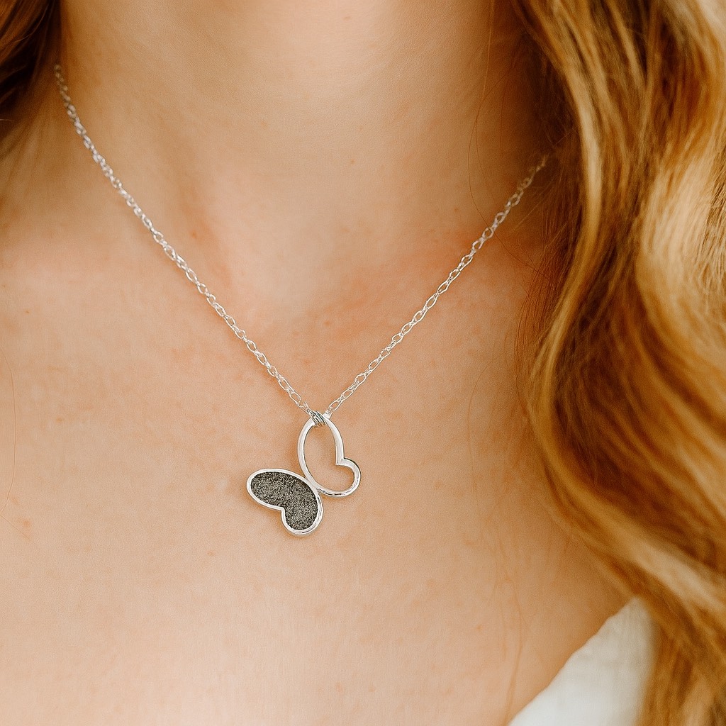 Su diseño en forma de mariposa, elaborado artesanalmente en plata de ley 925, representa la transformación, la libertad y la eternidad del recuerdo.