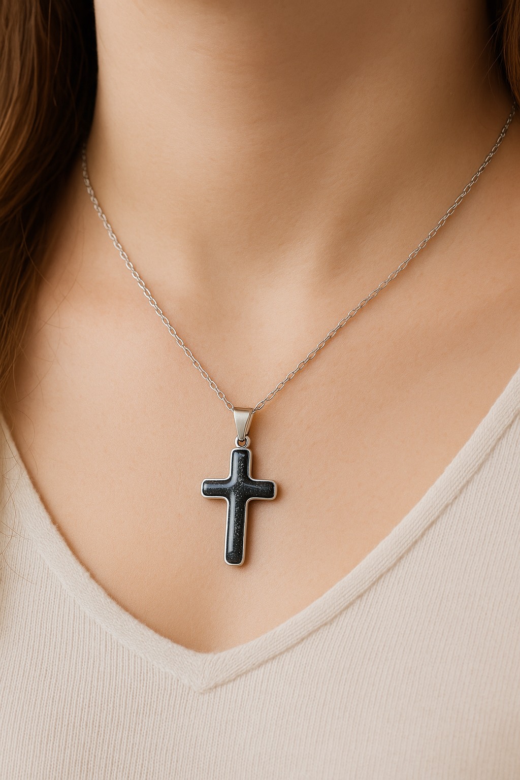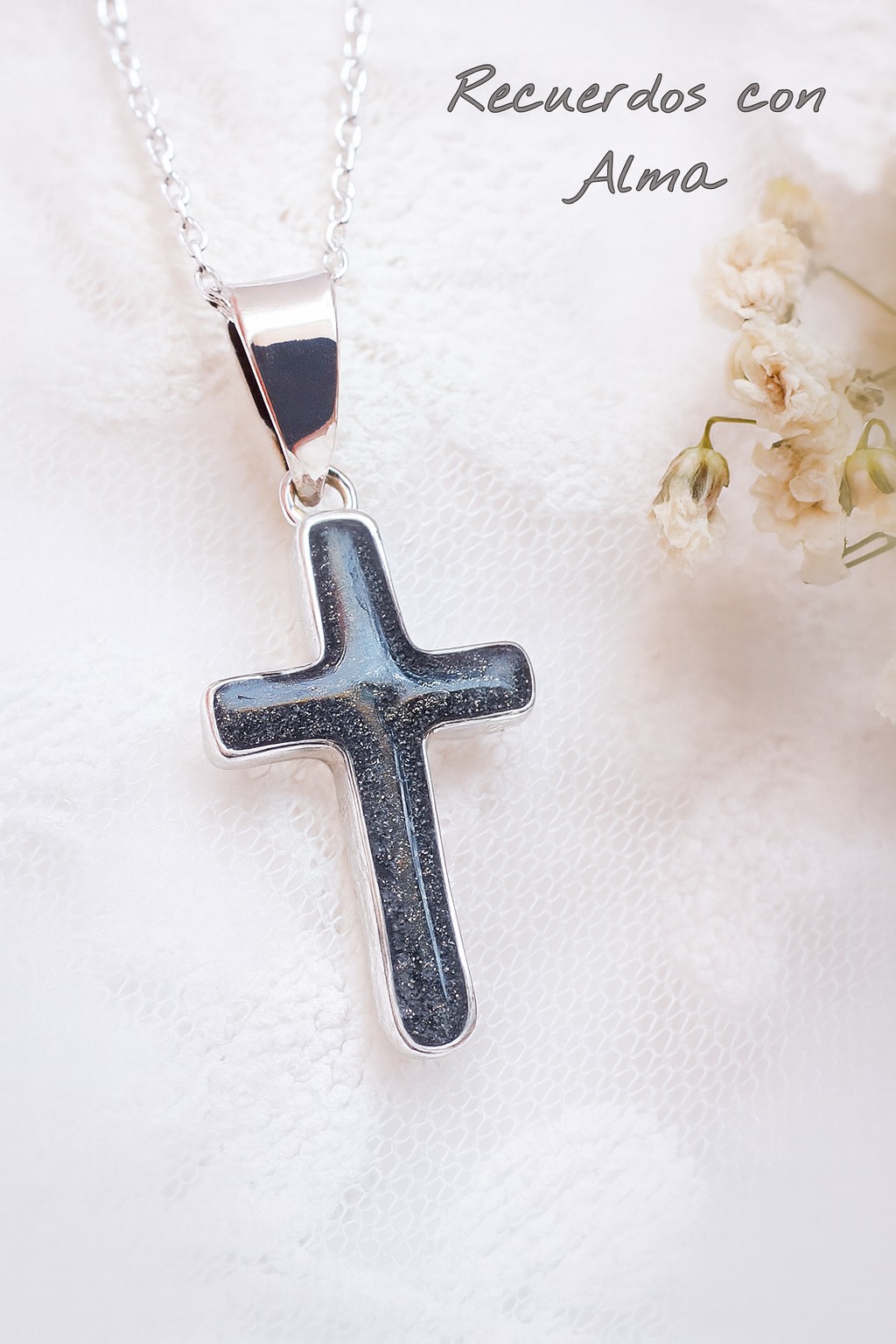 Esta delicada cruz está elaborada artesanalmente en plata de ley 925 y rellena con cenizas, convirtiéndose en una joya única y profundamente significativa.